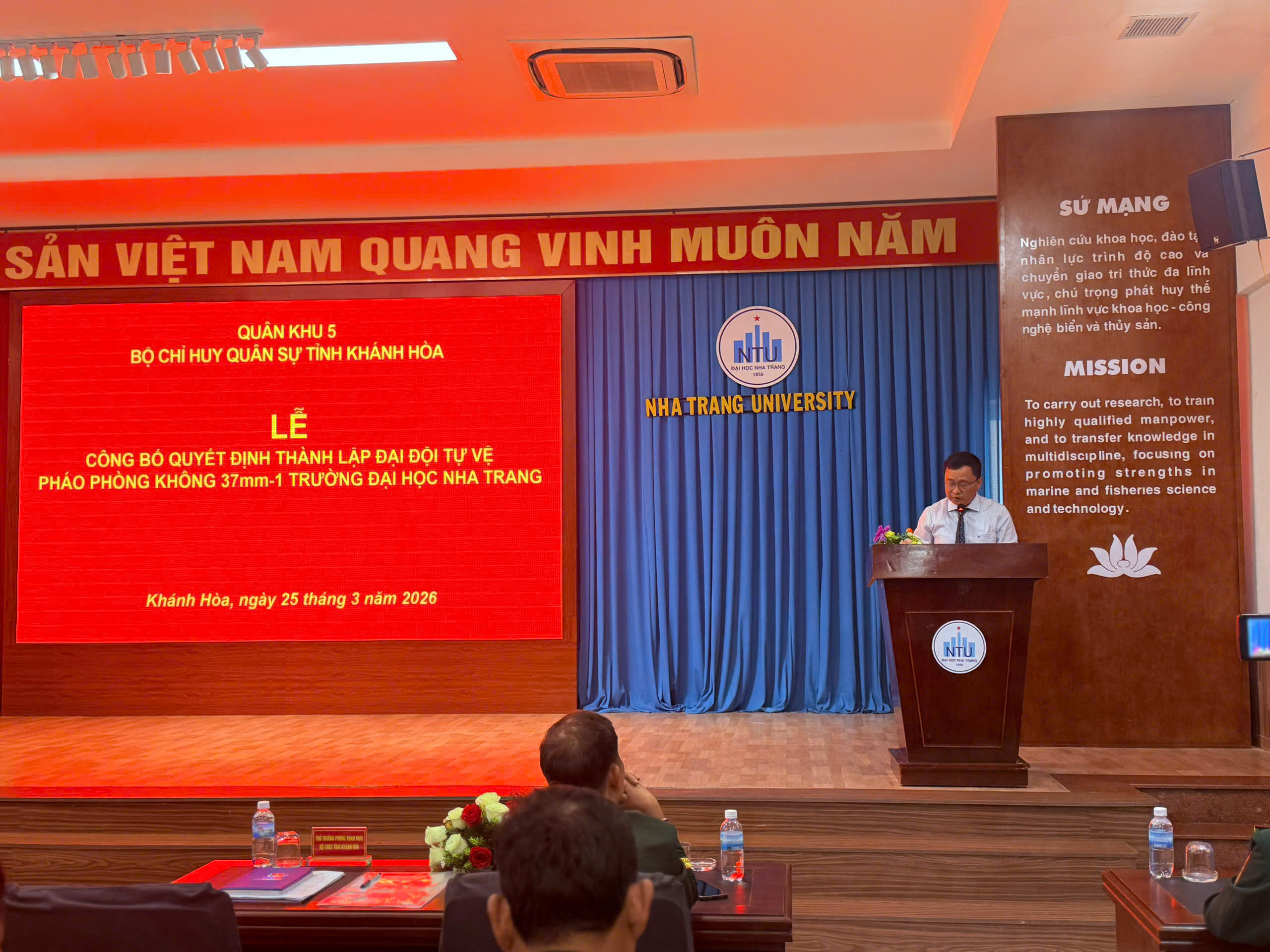Sáng ngày 25/3, tại Hội trường 1 Trường Đại học Nha Trang, Bộ Chỉ huy Quân sự tỉnh Khánh Hòa đã long trọng tổ chức Lễ công bố Quyết định thành lập Đại đội Tự vệ pháo phòng không 37mm-1 thuộc Bộ Chỉ huy Quân sự tỉnh đối với nhà trường.